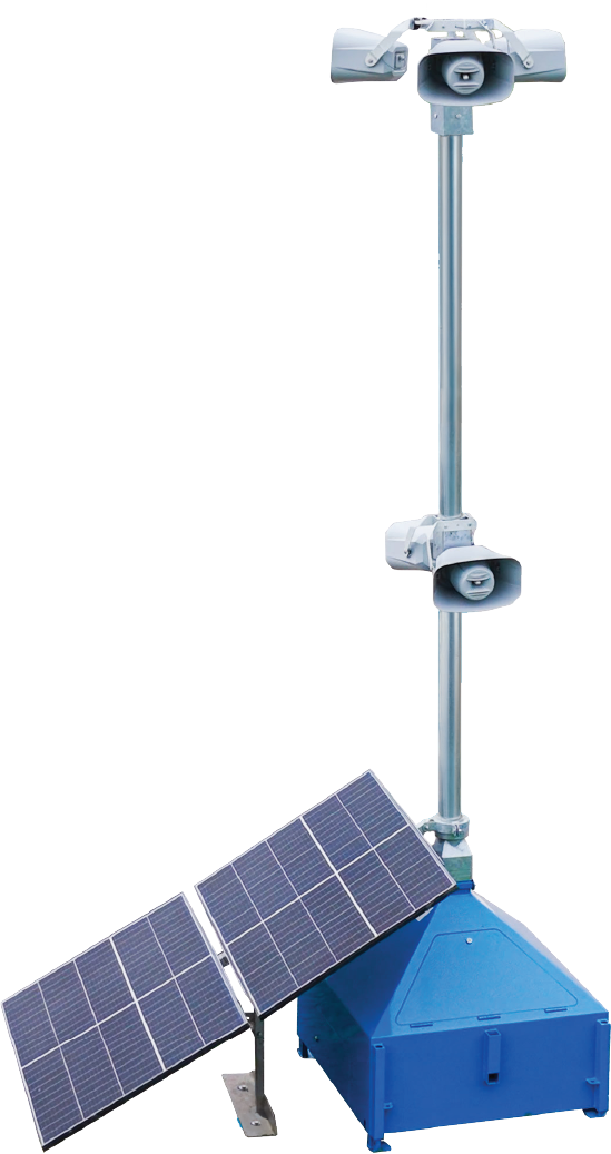 It can be easily positioned on-site using integrated wheels and a tow bar. The winch operated mast extends to deliver clear sound across large crowds with optional solar panels for extended operation.